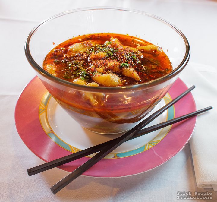 I did a food shoot for an upcoming review of Soga Shabu Shabu restaurant on State Street for Isthmus today. The photo editor gave me five dishes were reviewed in the article. I showed the list to Xiaoling (aka Rene) and Seya since it seemed that English wasn't their strong suit. I asked for one or two dishes to work with. They being eager to please types, I got all six! Fried duck, sliced pig ears, poached fish, spicy salad and their specialty shabu-shabu not to mention bubble tea and an alcohol-laden tropical fruit drink.